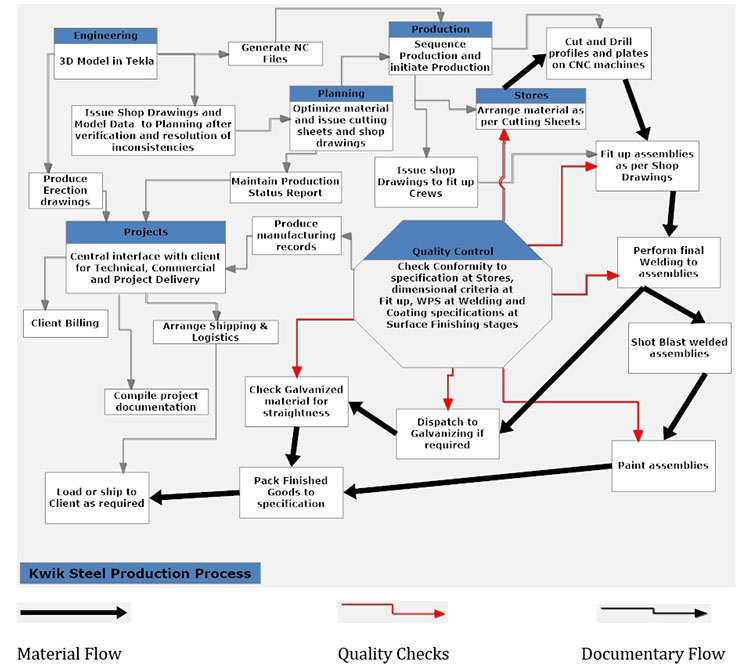 From the point of raw material receiving, right up till the finished structures are packed the material flows in one direction. The movement of material is handled by sixteen 10 ton overhead cranes. As far as possible, all profiles and beams are cut and drill on fully automatic CNC machines with their own conveyor systems. At this stage itself, each main assembly profile is machine punched with an assembly mark numbers for easy traceability and erection. Similarly, each plate part is also automatically machine punched during the cutting and drilling process as per the drawings for easy identification during fit up stage.